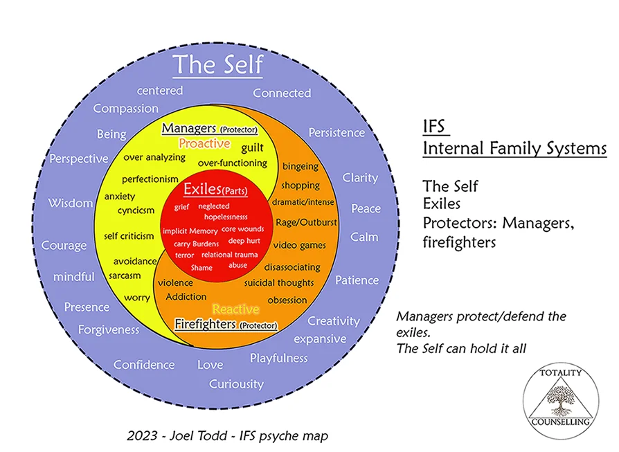 There are two types of protectors, in IFS they are called firefighters and managers. Manager parts are the parts of us that manage our internal defences proactively. They use our thoughts, emotions, thought patterns and bodily sensations to steer us away from potentially upsetting situations, to “keep emotional pain out of consciousness”.  If something gets past a manager, we have reactive protector parts that IFS calls firefighters. They rush in to make sure we aren’t overwhelmed (our nervous systems) in more drastic or intense ways. Firefighters can have us acting more destructively towards ourselves or others in the short term with things like addiction, bingeing, numbing, disassociating and thoughts relating to suicide. Managers are usually are more subtlety destructive, over time influencing us into patterns such as over-functioning in our relationships, perfectionism, keeping up appearances and avoiding conflict.